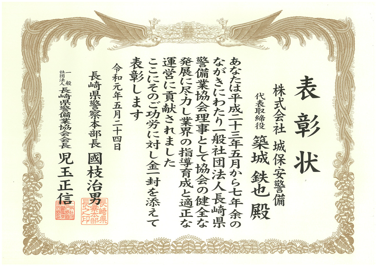 - 弊社、代表取締役築城鉄也が長崎県警察本部長・長崎県警備業協会会長より表彰状を頂きました。〔画像はこちら〕
