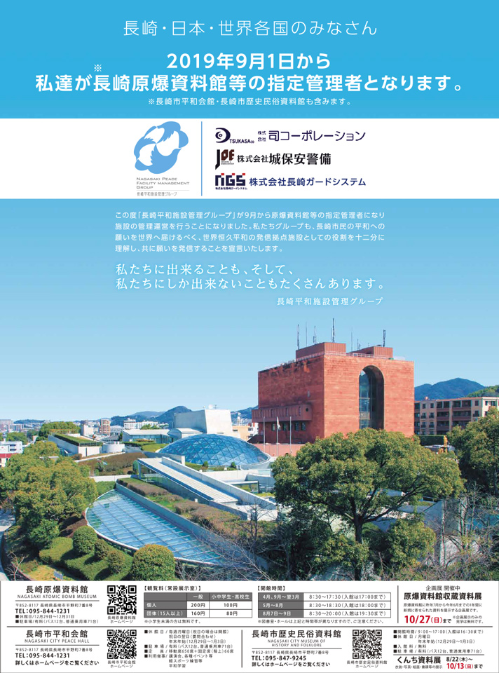 - 長崎平和施設管理グループ(司コーポレーション・長崎ガードシステム・城保安警備JV)が長崎原爆資料館・長崎市平和会館・長崎市歴史民俗資料館の指定管理者に承認されました。〔画像はこちら〕